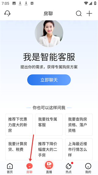 2、房聊頁有智能客服提供專屬購房方案,可咨詢優(yōu)惠新房、房貸稅費等問題,也能找專屬客服或查購房落戶資格。