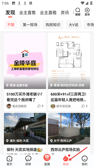 4、熱點頁有業(yè)主直售、資訊等板塊,展示金陵華庭、保利虹橋和頌等房產資訊,可看樓盤解析、實地探盤,獲取樓市熱點信息。