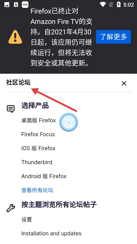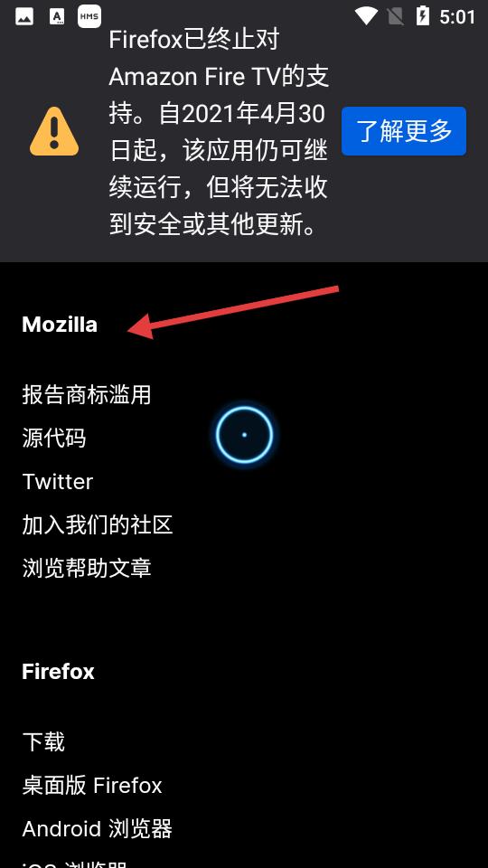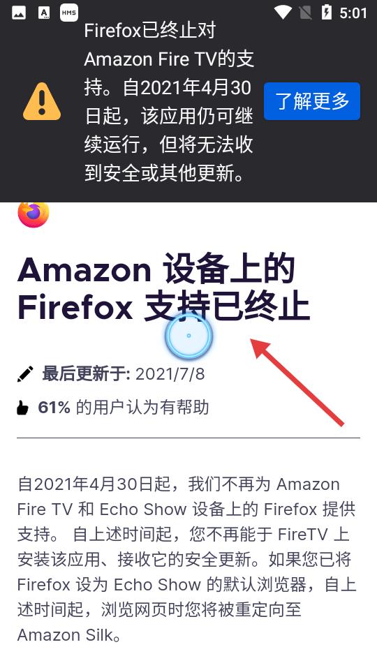 1、點擊顯示Firefox自2021年4月30日起終止對Amazon FireTV的支持,應(yīng)用可運行但無更新,有相關(guān)說明。