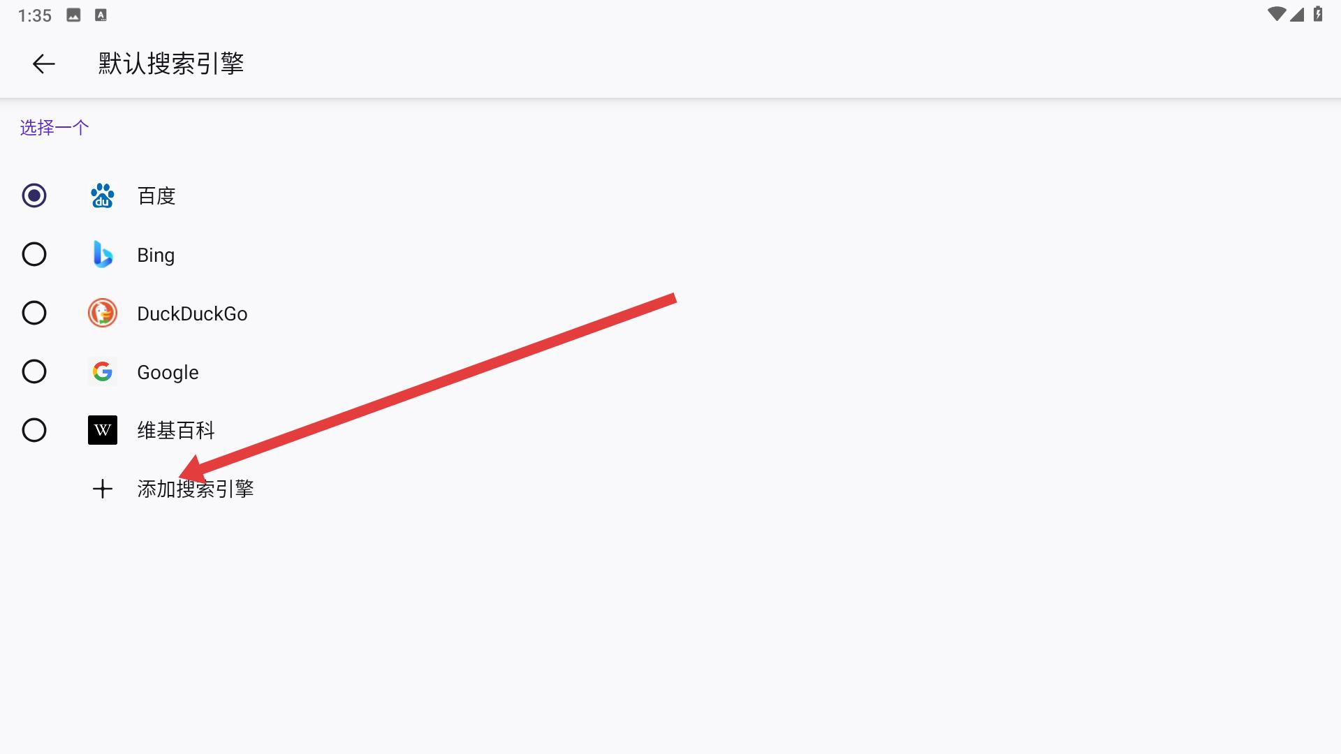 3、默認搜索引擎頁面,可看到已有百度、Bing等選項,點擊添加搜索引擎選項。