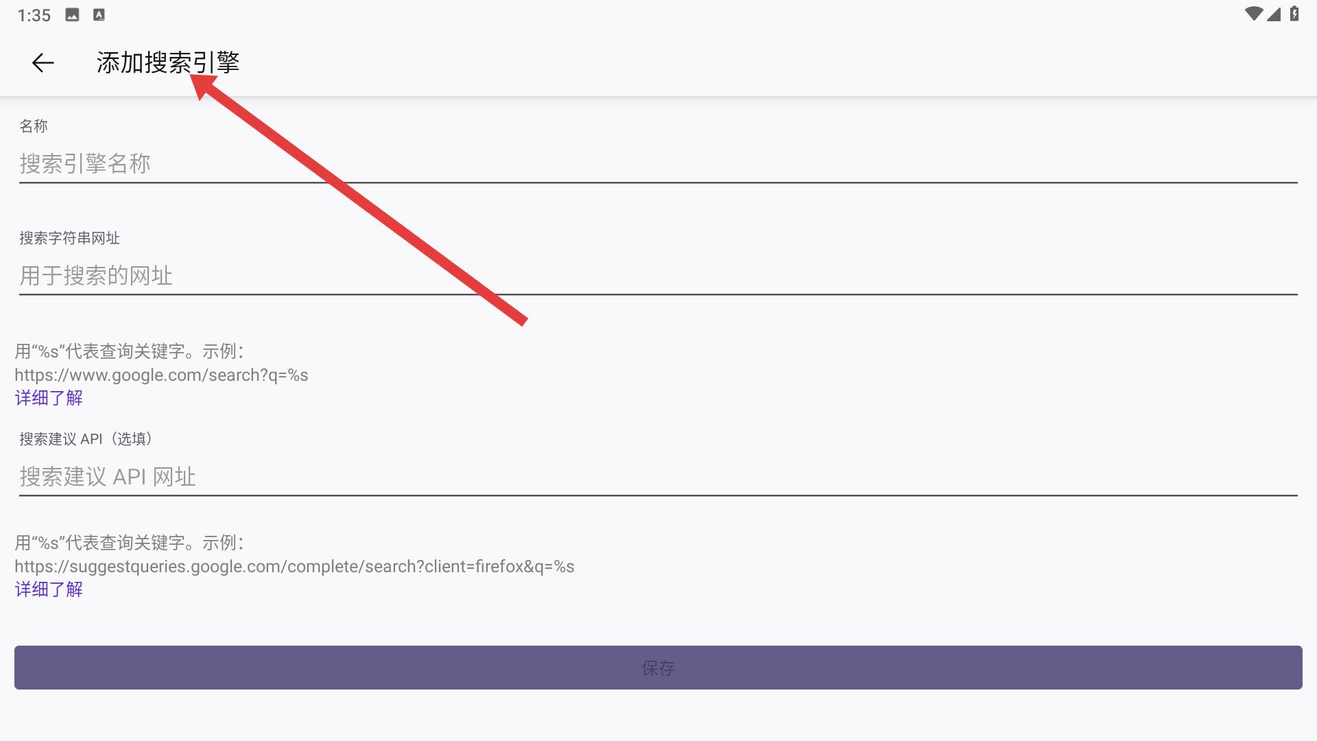 4、進入添加搜索引擎界面,可輸入搜索引擎名稱、搜索字符串網(wǎng)址等信息,完成后點擊保存。