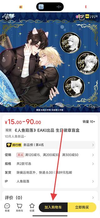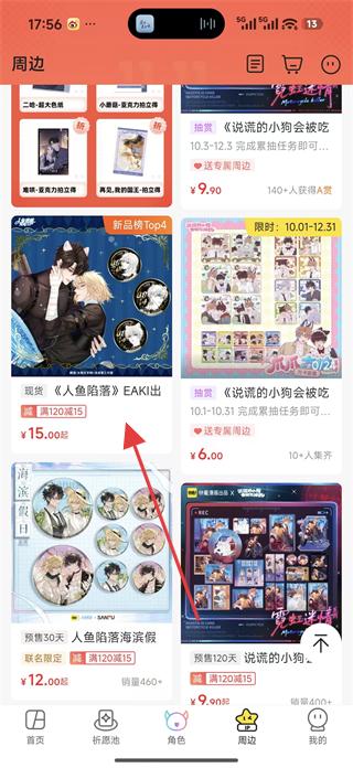 2、登錄后進(jìn)入周邊頁面,看到各類周邊商品,點(diǎn)擊人魚陷落盲盒商品,進(jìn)入該商品詳情頁面。