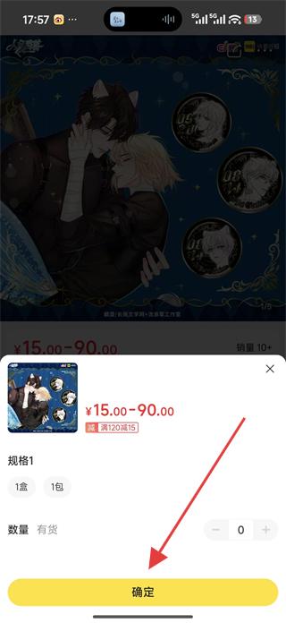 4、在規(guī)格選擇頁面,選擇商品規(guī)格和數(shù)量,點(diǎn)擊確定按鈕,完成商品加入購(gòu)物車操作,后續(xù)可前往購(gòu)物車結(jié)算,購(gòu)買喜歡的周邊商品。