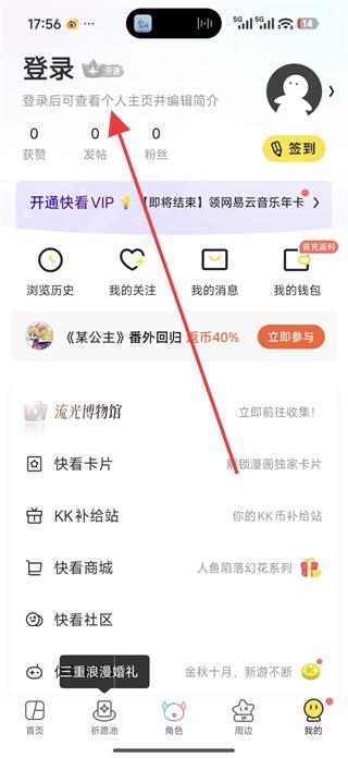 1、打開快看漫畫軟件,進(jìn)入我的頁面點(diǎn)擊登錄按鈕,完成賬號(hào)登錄,后續(xù)可查看個(gè)人主頁和編輯簡(jiǎn)介。