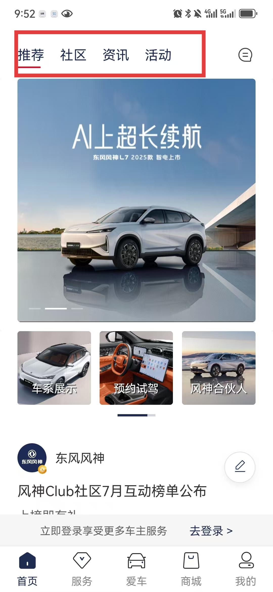 1、APP首頁設(shè)有推薦、社區(qū)、資訊、活動(dòng)等板塊,如推薦板塊會(huì)展示熱門車型、優(yōu)惠活動(dòng)等內(nèi)容,社區(qū)板塊可供車主交流用車心得、分享經(jīng)驗(yàn)等,全方位了解產(chǎn)品相關(guān)內(nèi)容。