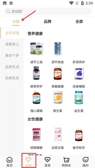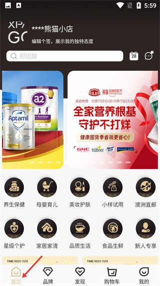 1、首頁有搜索欄,設(shè)養(yǎng)生保健、母嬰育兒等功能入口,推全家營養(yǎng)根基活動,底部有首頁、品牌等功能欄。