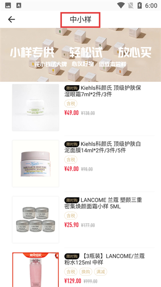 3、中小樣板塊,展示科顏氏眼霜、蘭蔻面霜等中小樣商品,標注價格、折扣,用戶可花小錢試大牌,低成本嘗鮮。