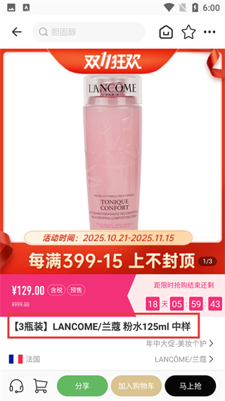4、蘭蔻粉水中樣商品頁,3瓶裝125ml粉水售價129元,參與雙11每滿399、15活動,用戶可分享、加入購物車或馬上搶。