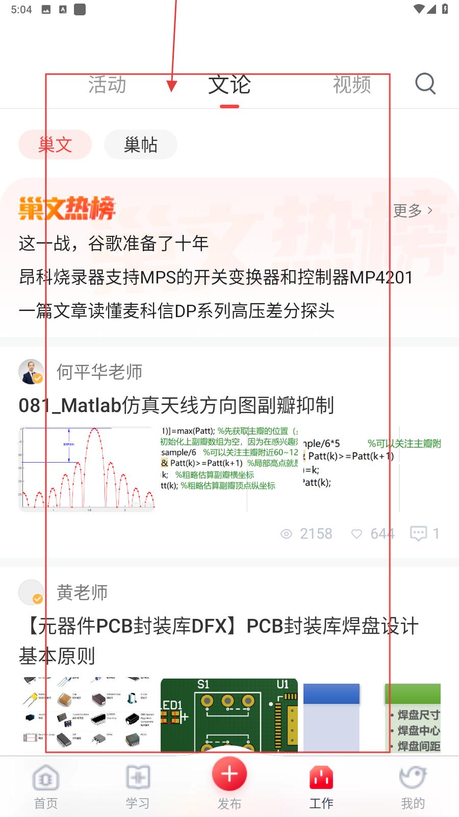 1、進(jìn)入工作界面的文論板塊,可瀏覽巢文熱榜及專業(yè)技術(shù)文章,如PCB封裝庫焊盤設(shè)計等內(nèi)容,助力電子行業(yè)從業(yè)者學(xué)習(xí)專業(yè)知識、提升技術(shù)水平。