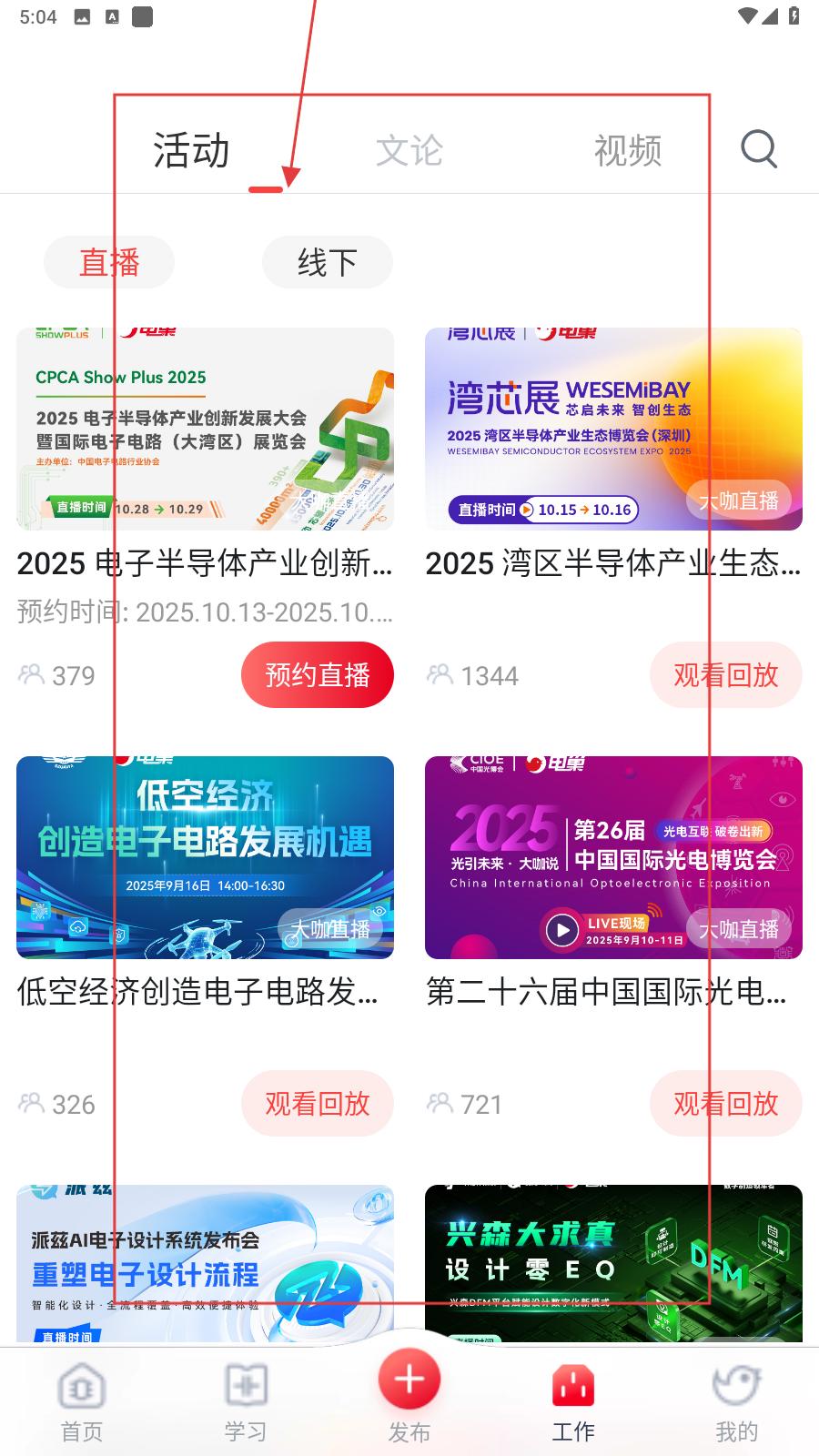 2、在工作界面的活動板塊,可查看電子半導(dǎo)體、灣區(qū)半導(dǎo)體等行業(yè)展會直播及回放,如灣芯展等,還能預(yù)約直播,幫助從業(yè)者及時掌握行業(yè)動態(tài)與前沿資訊。