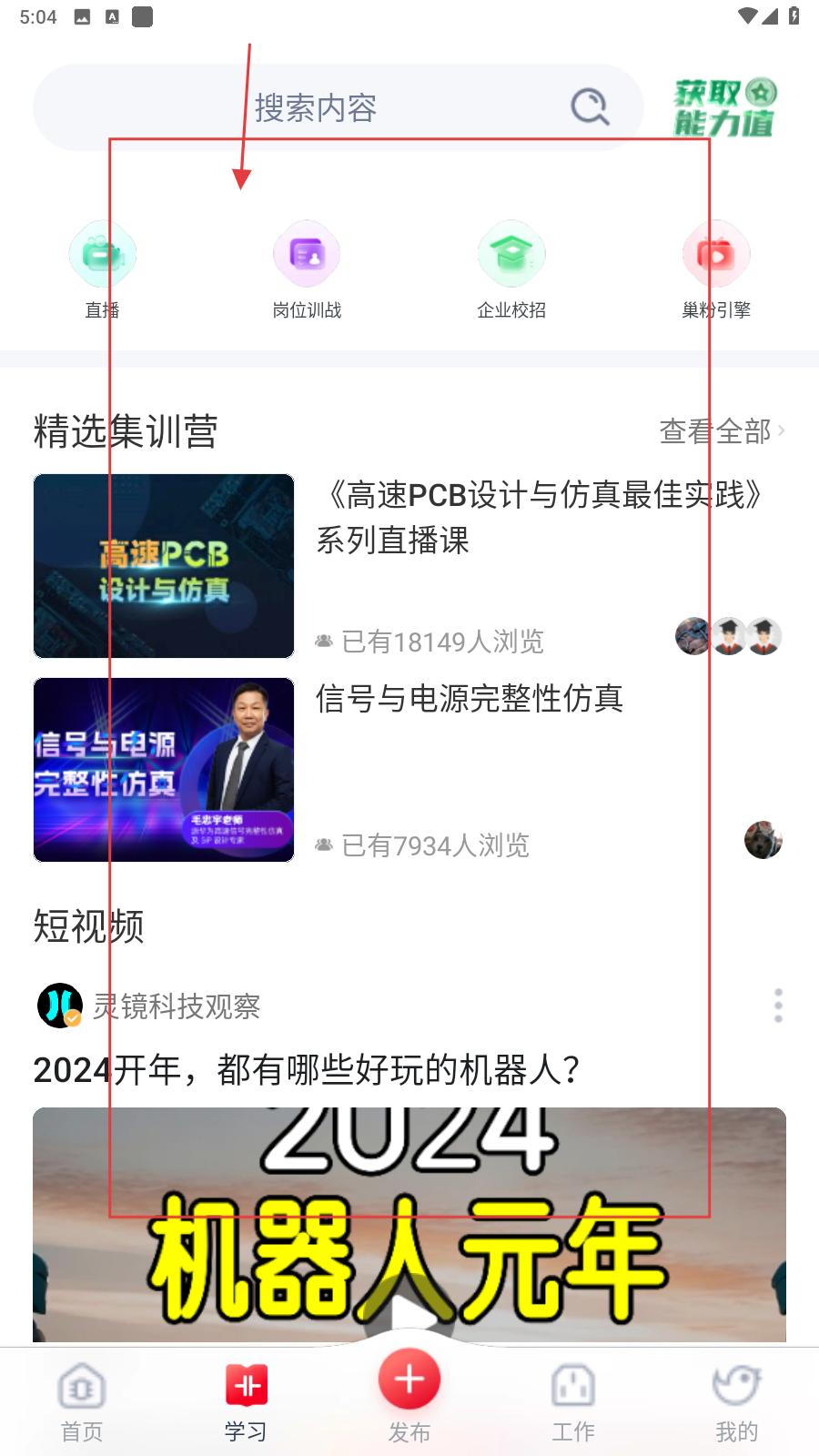 3、學(xué)習(xí)界面有直播、崗位訓(xùn)戰(zhàn)、企業(yè)校招、巢粉引擎功能,還有精選集訓(xùn)營課程如高速PCB設(shè)計與仿真、信號與電源完整性仿真,助力用戶提升職業(yè)技能。
