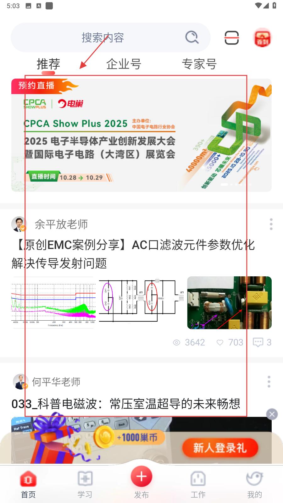 4、首頁推薦板塊可查看電子行業(yè)專家文章,如EMC案例分享、電磁波科普等,還有行業(yè)展會直播預(yù)告,幫助從業(yè)者獲取專業(yè)知識,促進(jìn)技術(shù)交流與行業(yè)合作。