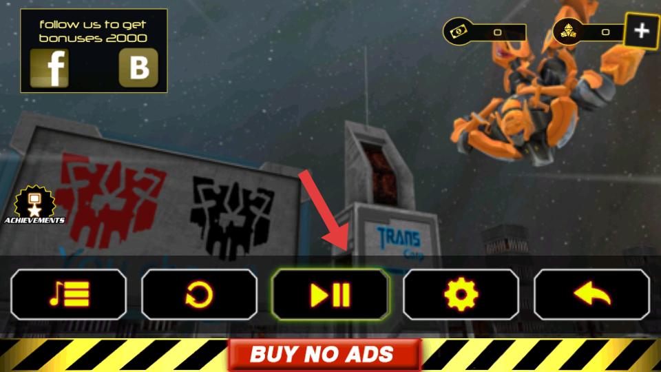 1、游戲初始界面有播放,設(shè)置等按鈕,還有BUY NO ADS選項(xiàng),點(diǎn)擊播放按鈕,就能開(kāi)啟變形機(jī)器人的冒險(xiǎn)之旅。