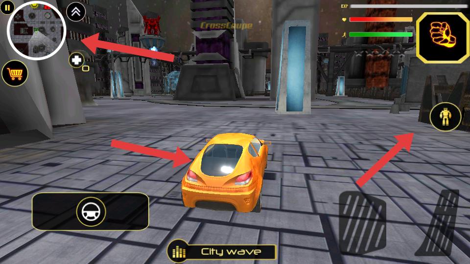 4、城市場(chǎng)景里可變身成汽車移動(dòng),左側(cè)有小地圖輔助,標(biāo)注處是變身技能按鈕,可用按鈕變身成機(jī)器人形態(tài)。