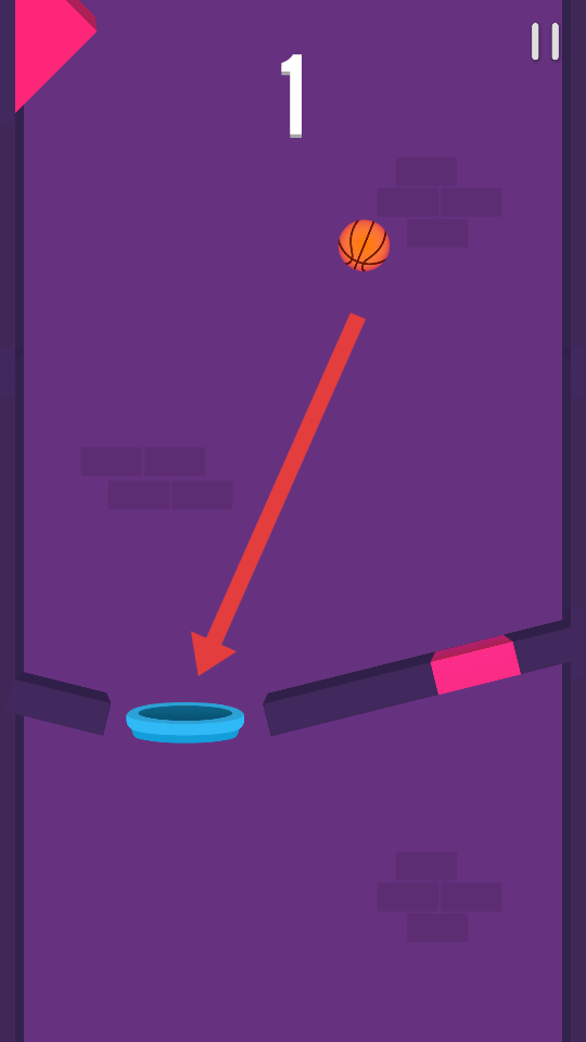 3、隨著游戲進行,利用場景中的粉色跳板等元素,調整籃球軌跡,使其再次落入容器,此時分數(shù)變?yōu)?,持續(xù)獲取分數(shù)。