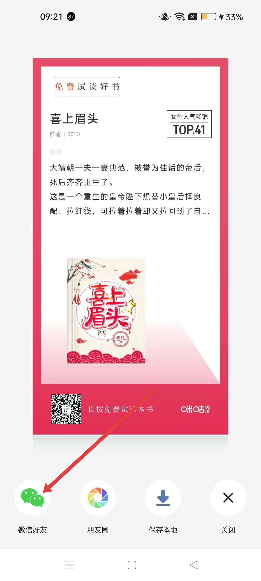 4、生成海報界面,點擊微信好友,可將書籍海報分享給微信好友,也可選擇分享到朋友圈或保存本地。