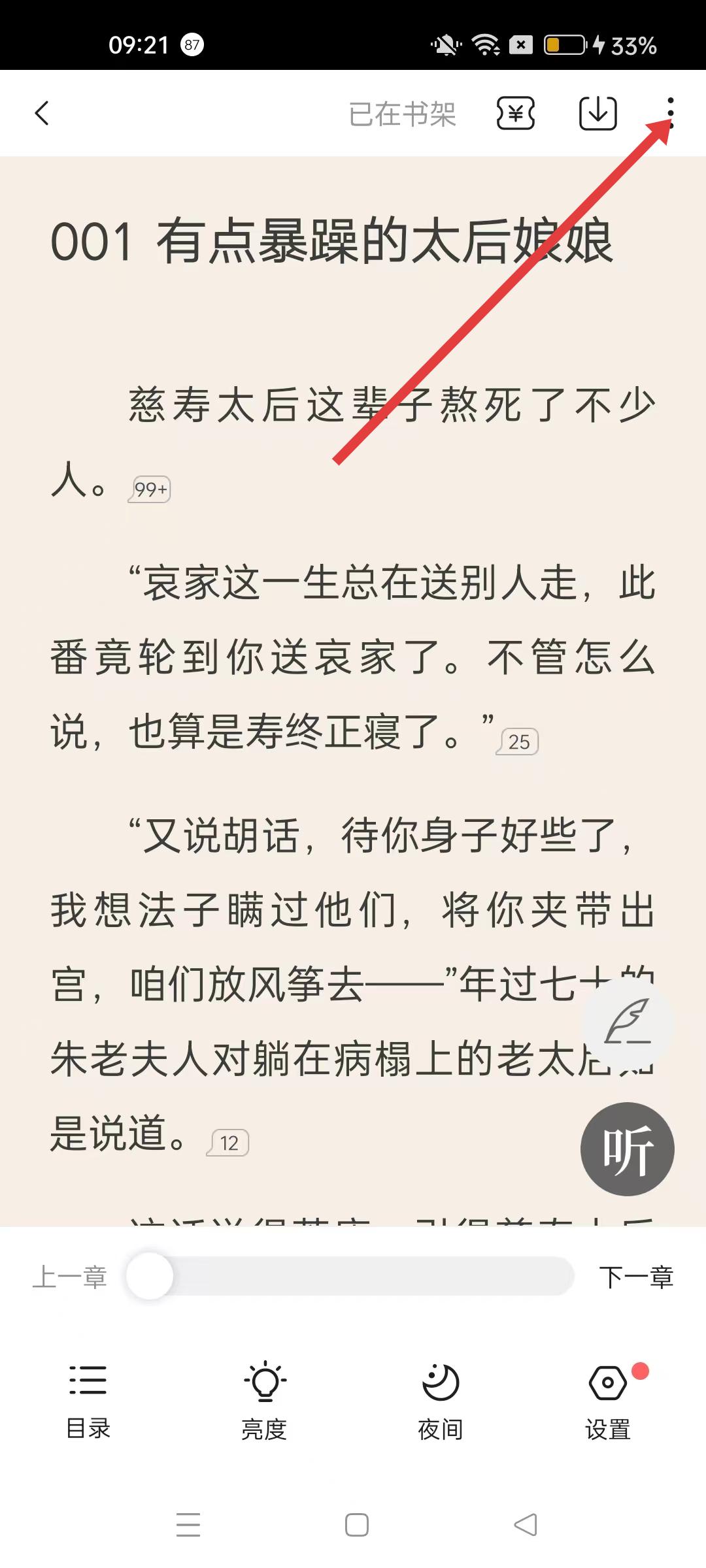 2、書籍閱讀界面,點擊右上角的三點菜單按鈕,彈出分享等功能選項。