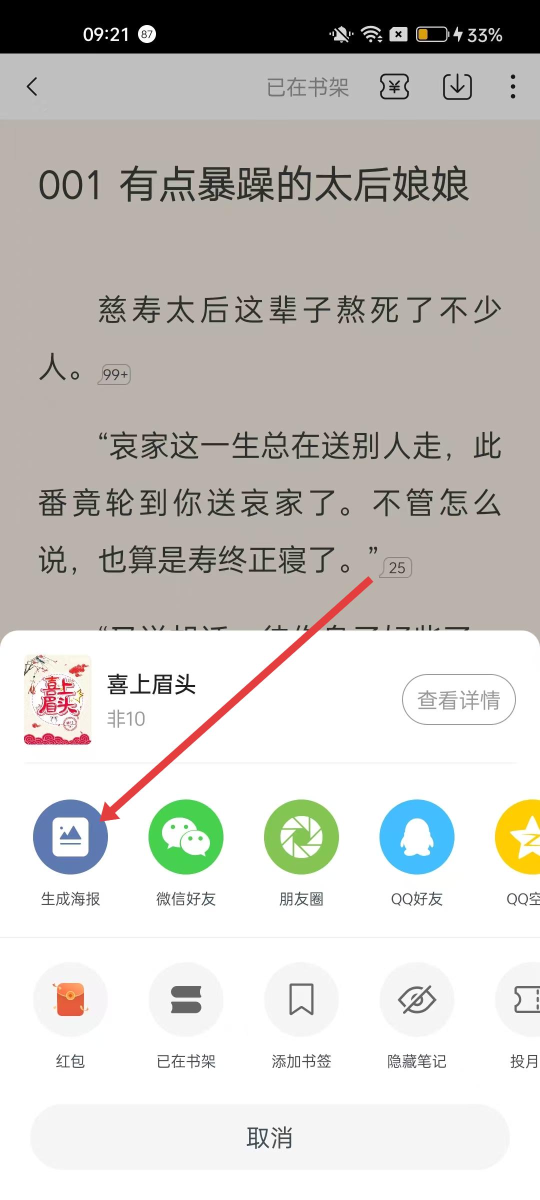 3、彈出的功能選項中,點擊生成海報,可生成該書籍的分享海報。