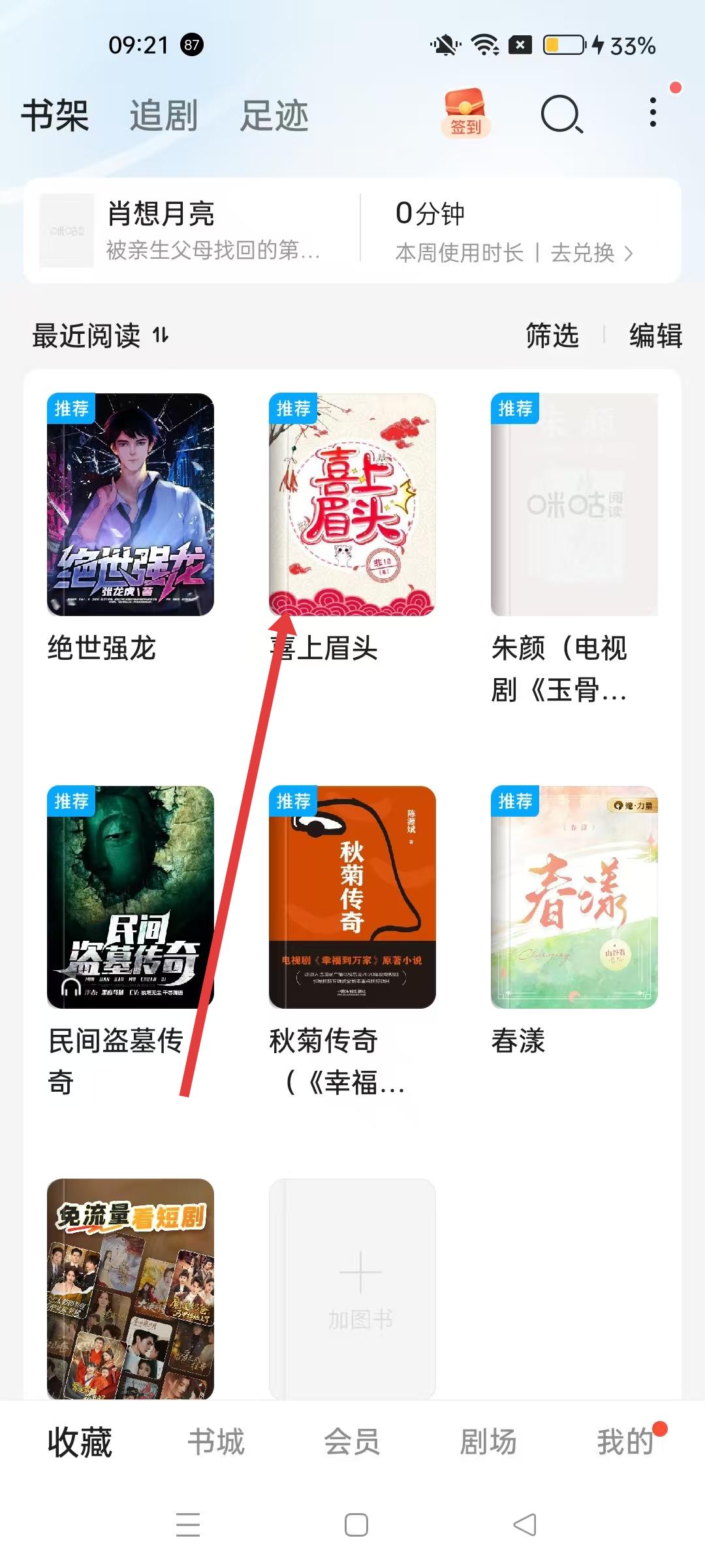 1、咪咕閱讀APP收藏界面,點擊想要分享的書籍,進入書籍閱讀界面。