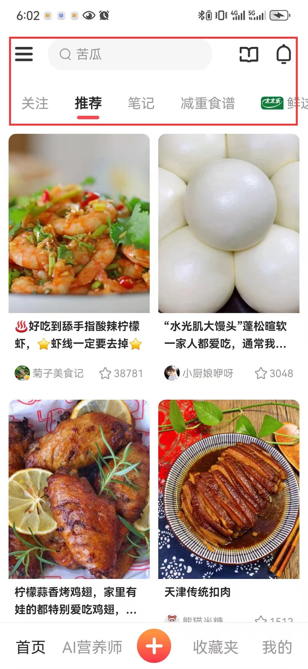 2、首頁這里有關(guān)注、推薦等欄目,例如在首頁的推薦等欄目中,會展示各類美食圖片和名稱,點擊感興趣的菜譜進(jìn)入詳情頁,查看該菜品的具體信息。