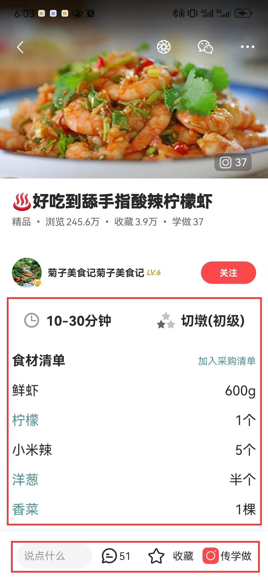 3、進(jìn)入菜譜詳情頁后可以看到制作該菜品所需的食材清單,還能了解預(yù)計制作時間和難度,此外下方有收藏、傳學(xué)做等功能按鈕,方便你收藏菜譜和分享自己的制作成果。