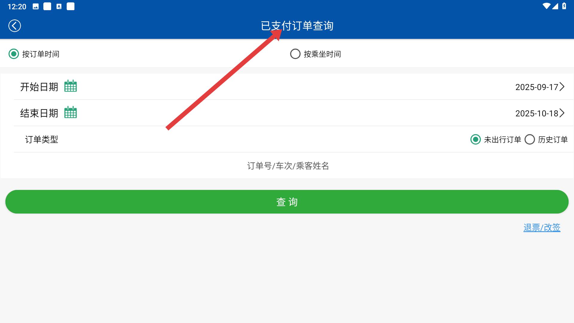 3、登錄后,可進(jìn)行已支付訂單查詢,進(jìn)入已支付訂單查詢頁面,可選擇按訂單時(shí)間或乘坐時(shí)間,設(shè)置開始日期點(diǎn)擊查詢,查看對(duì)應(yīng)訂單。