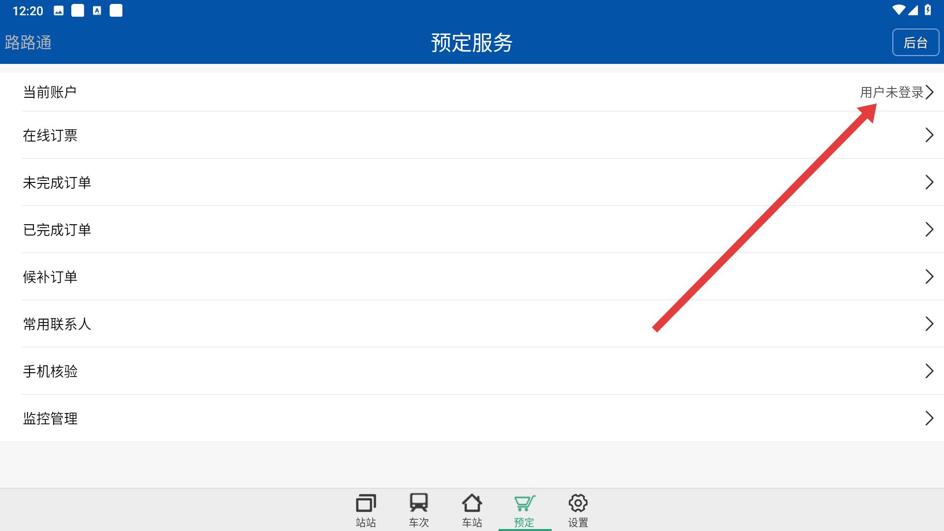 1、打開路路通軟件,點(diǎn)擊下方預(yù)定選項(xiàng),進(jìn)入預(yù)定服務(wù)頁面,能看到當(dāng)前賬戶顯示用戶未登錄、在線訂票等功能選項(xiàng)。