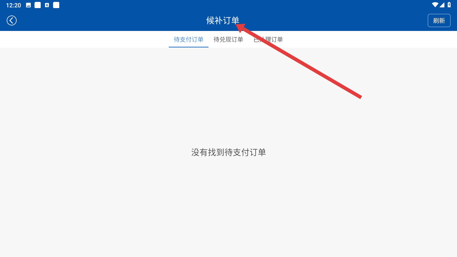 4、也可查看候補(bǔ)訂單,進(jìn)入候補(bǔ)訂單頁面,能看到待支付訂單、待兌現(xiàn)訂單、已處理訂單等分類,查看各分類下的訂單情況,當(dāng)前待支付訂單顯示沒有找到待支付訂單。