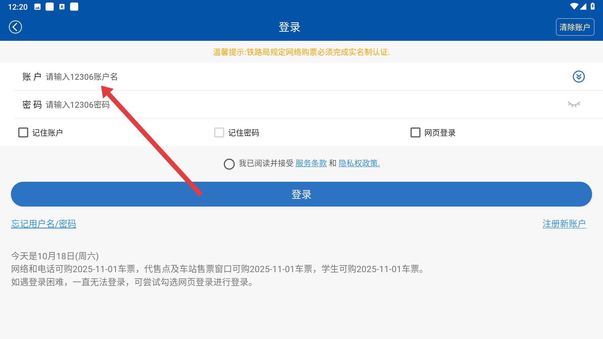 2、若要進(jìn)行訂單相關(guān)操作,需先登錄,點(diǎn)擊當(dāng)前賬戶處的用戶未登錄,進(jìn)入登錄頁面,輸入12306賬戶名和密碼,勾選已閱讀并接受服務(wù)條款和隱私權(quán)政策后,點(diǎn)擊登錄。