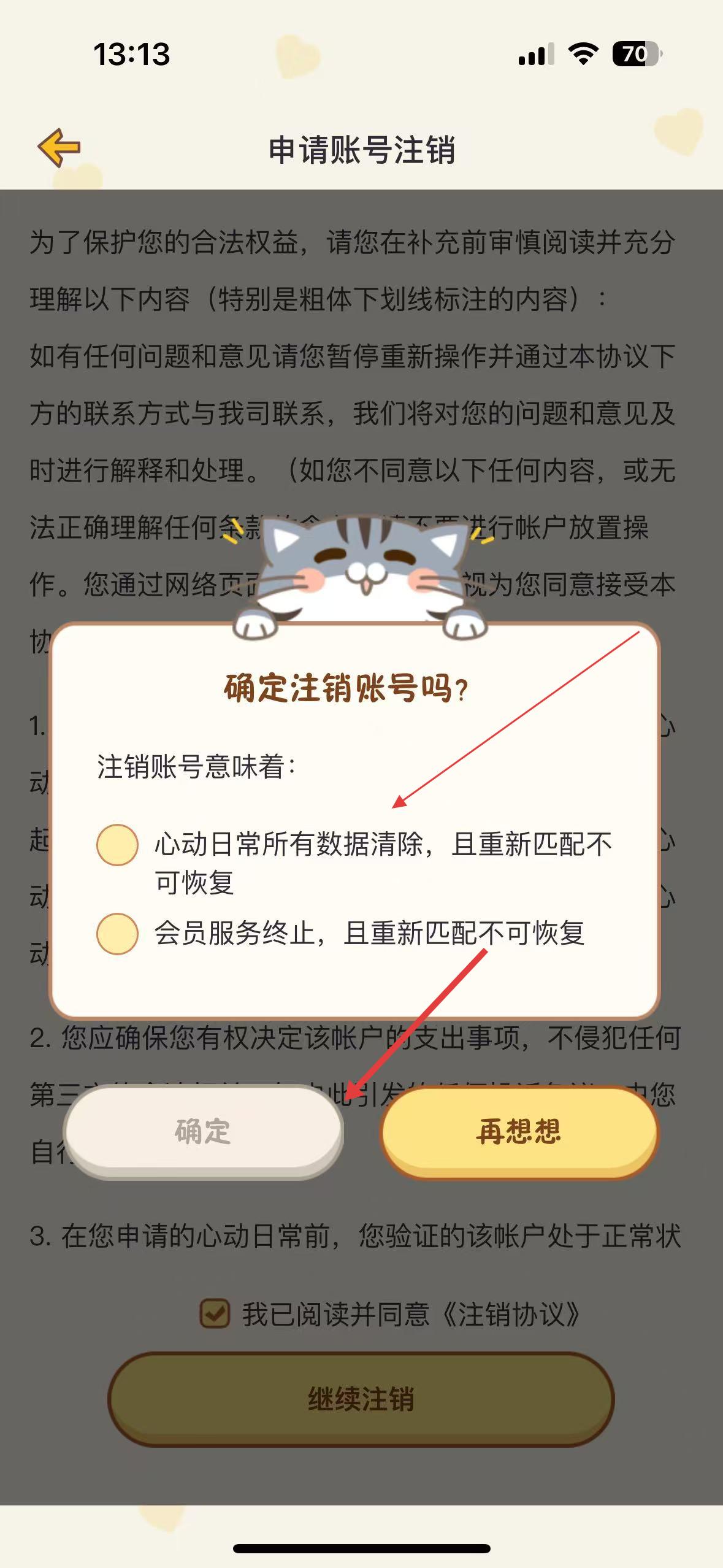 3、注銷確認(rèn)界面,提示用戶注銷賬號意味著心動(dòng)日常所有數(shù)據(jù)清除、會(huì)員服務(wù)終止且不可恢復(fù),用戶可選擇確定注銷或再想想。