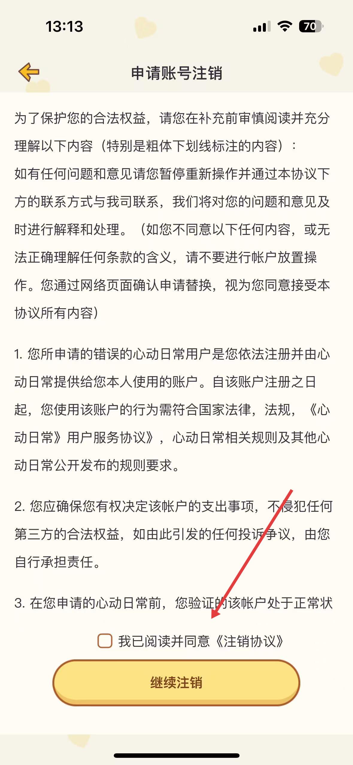 2、申請賬號注銷界面,用戶需閱讀并同意注銷協(xié)議,了解賬號使用需符合規(guī)定等內(nèi)容,勾選后可繼續(xù)注銷流程。