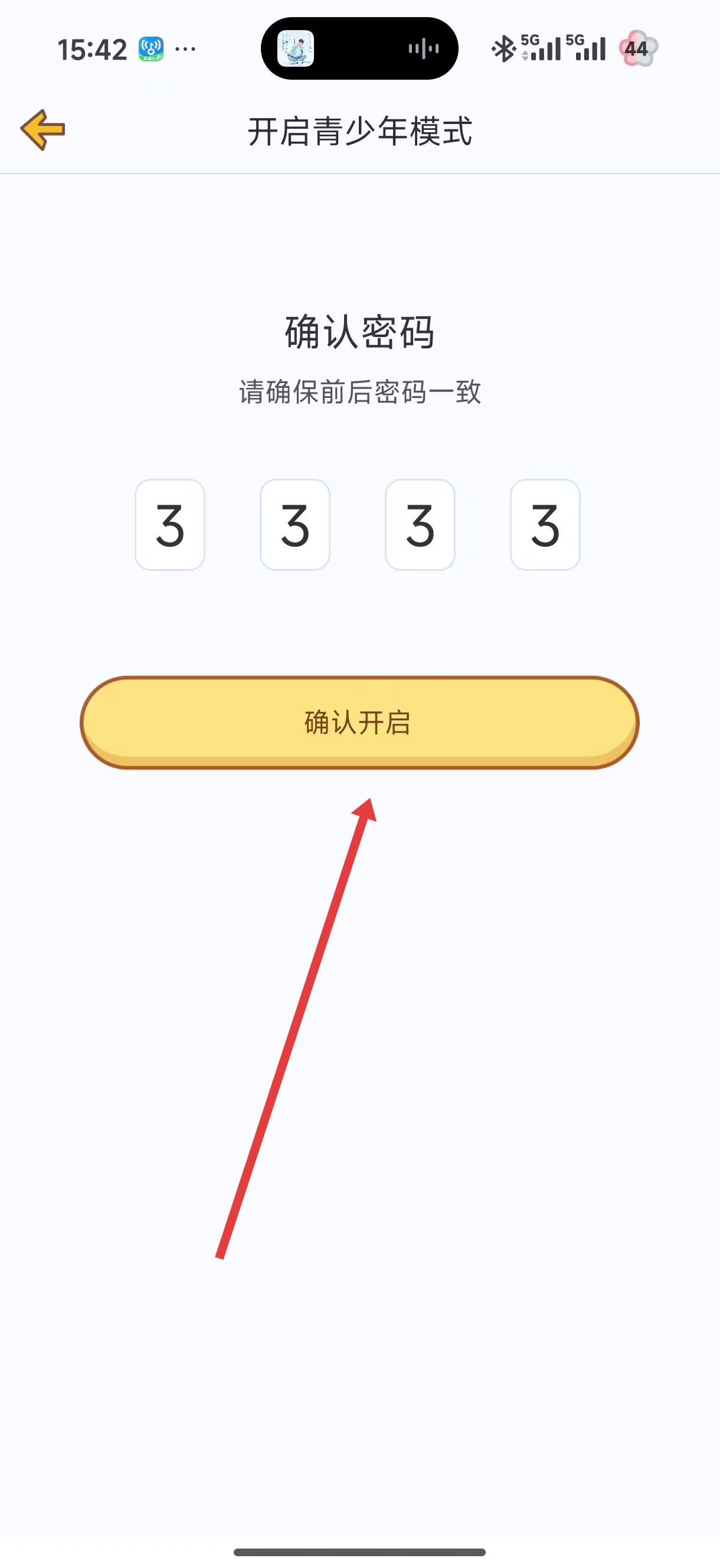 3、在確認(rèn)密碼界面再次輸入之前設(shè)置的密碼,確保前后密碼一致,輸入完成后,點(diǎn)擊確認(rèn)開啟按鈕,開啟青少年模式。