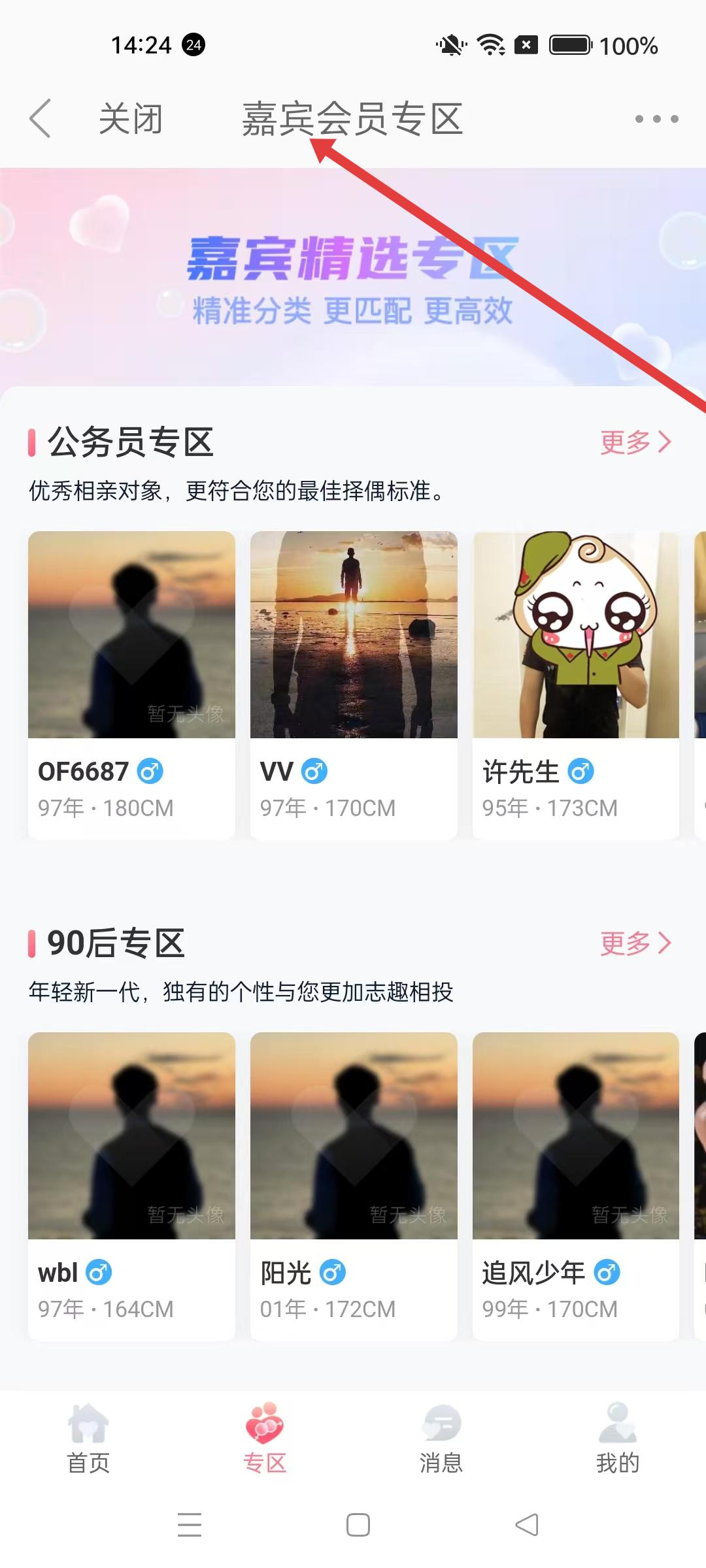 4、登錄后,進(jìn)入嘉賓會員專區(qū),可查看公務(wù)員專區(qū)、90后專區(qū)等不同分類的相親嘉賓信息,尋找合適的相親對象。