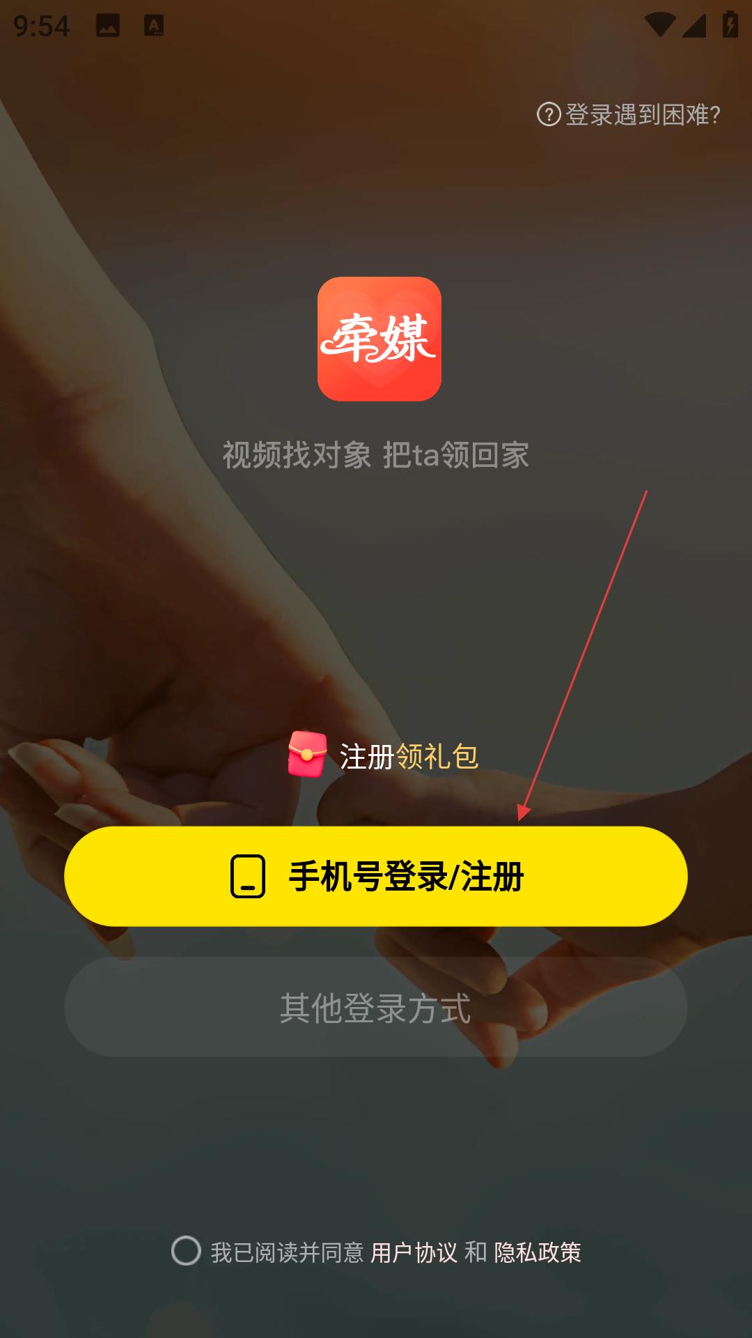 2、進(jìn)入登錄界面,展示了牽媒的標(biāo)志和宣傳語,用戶可選擇手機(jī)號登錄、注冊或其他登錄方式。