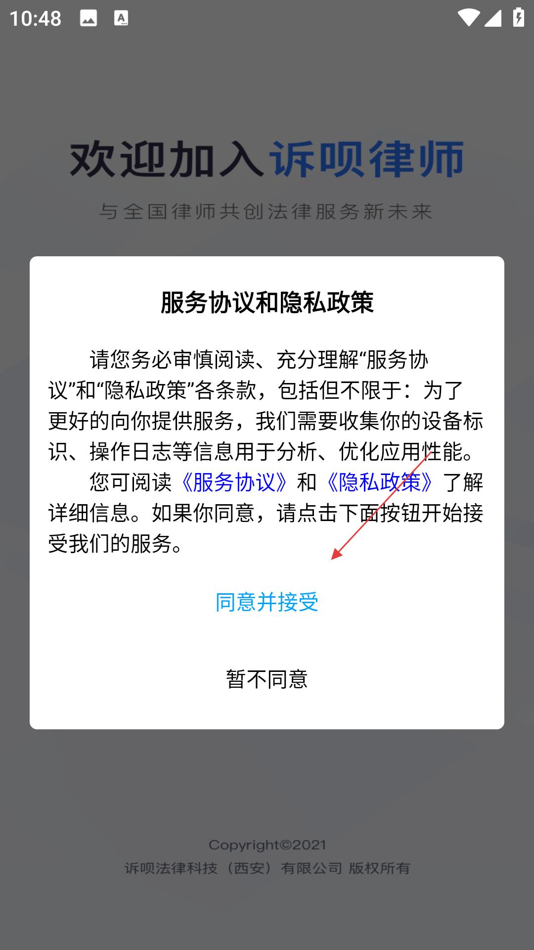 1、下載安裝完成后進(jìn)入,需在用戶協(xié)議和隱私政策界面點(diǎn)擊同意,接受相關(guān)條款后才能進(jìn)入應(yīng)用。