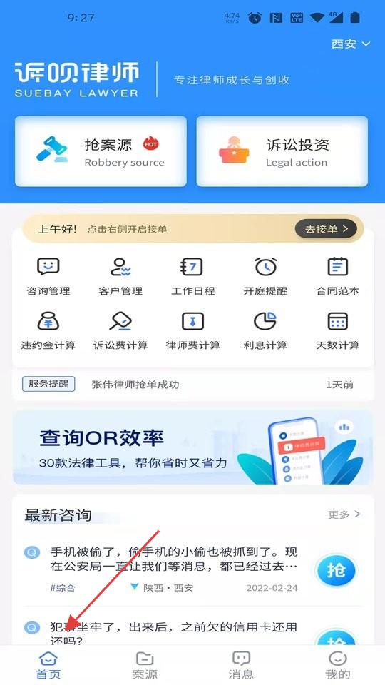 3、進(jìn)入App首頁(yè),有搶案源、訴訟投資等功能,還有咨詢管理、客戶管理等工具,助力律師辦案與成長(zhǎng)。