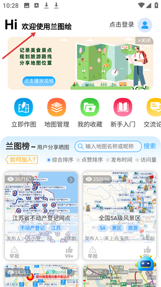 1、歡迎頁可登錄,有立即作圖、地圖管理、我的收藏等功能,還能查看用戶分享的地圖曬圖,如江蘇省不動(dòng)產(chǎn)登記網(wǎng)點(diǎn)、全國5A級風(fēng)景區(qū)地圖。