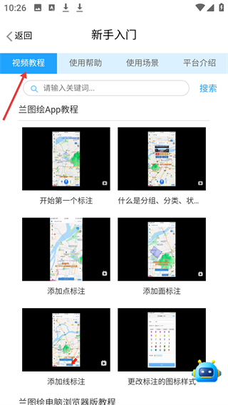 2、視頻教程板塊有蘭圖繪App教程視頻,涵蓋開始第一個(gè)標(biāo)注、添加點(diǎn)線面標(biāo)注、更改標(biāo)注樣式等內(nèi)容,直觀教學(xué)操作。