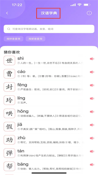 1、漢語(yǔ)字典界面,可查漢字筆順、發(fā)音、組詞,支持拼音和部首查詢,猜你喜歡列世、曹等字,配發(fā)音按鈕助漢字學(xué)習(xí)。