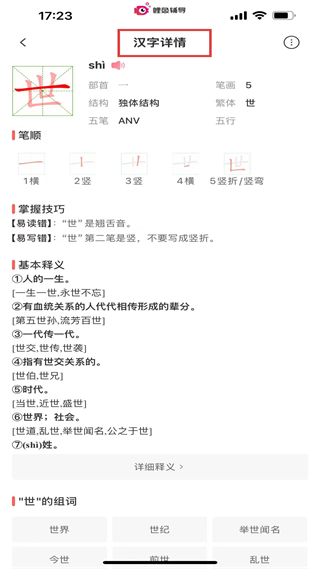 2、世字詳情頁(yè)展示其部首、筆畫、筆順,還有易讀錯(cuò)寫技巧、多釋義及組詞,從多維度助力用戶掌握該漢字。