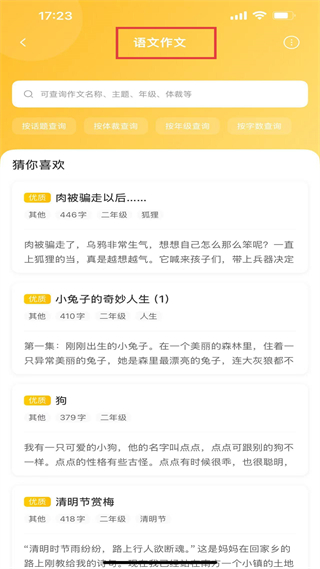 3、語(yǔ)文作文界面可按多維度查詢作文,猜你喜歡有肉被騙走以后等優(yōu)質(zhì)作文,為學(xué)生提供寫作參考。