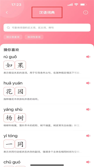4、漢語(yǔ)詞典界面,可查詞語(yǔ)近反義、例句,支持分類和詞性查詢,猜你喜歡列如果、花園等詞,帶發(fā)音助詞語(yǔ)學(xué)習(xí)。
