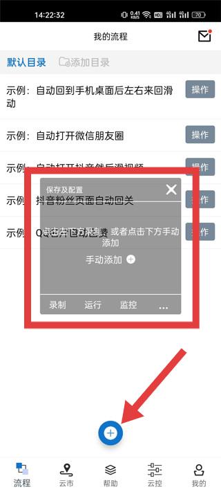 1、打開觸控精靈軟件,在流程界面有一個添加按鈕打開,會彈出一個浮窗,我們就要在這個小浮窗上進行操作。