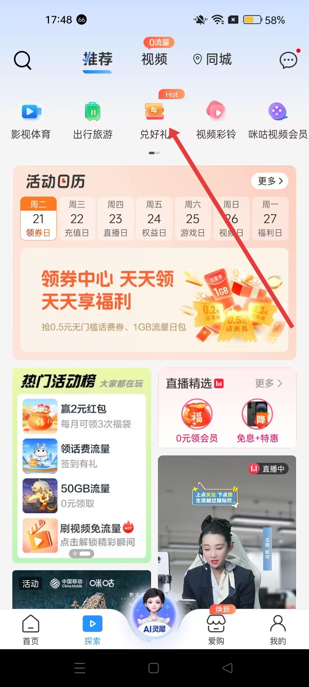 2、探索頁面,點擊兌好禮,進(jìn)入中國移動積分商城,查看可兌換的商品種類。