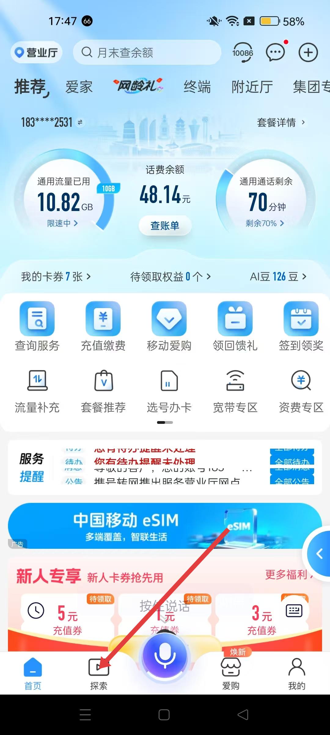 1、打開移動營業(yè)廳APP,首頁點擊探索,進(jìn)入探索頁面,開始積分兌換操作。