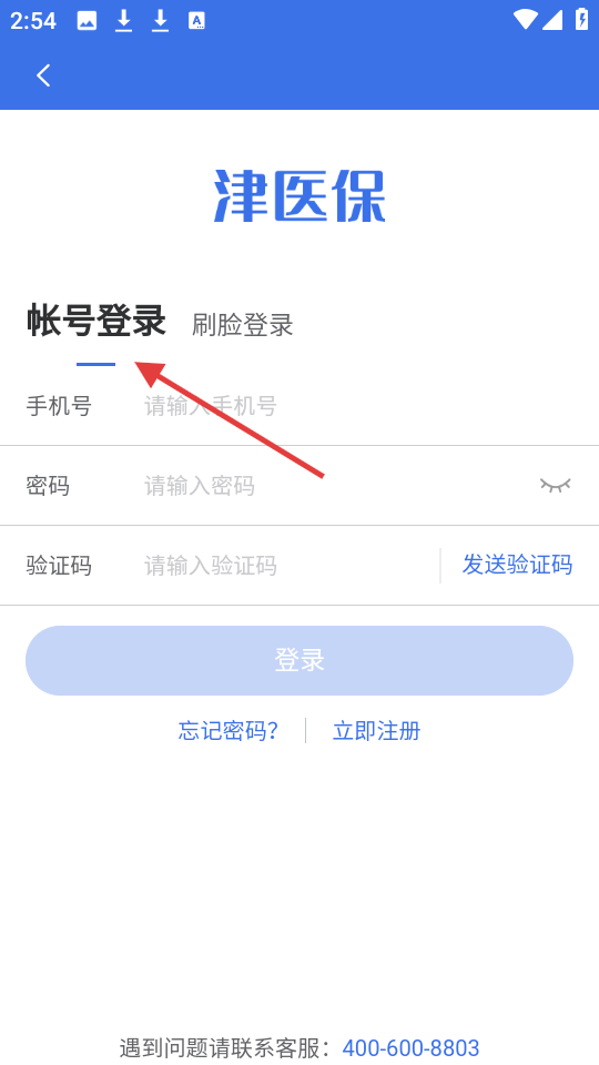 1、津醫(yī)保登錄頁(yè)有賬號(hào)和刷臉登錄,賬號(hào)登錄需手機(jī)號(hào)、密碼與驗(yàn)證碼,設(shè)忘記密碼和注冊(cè)功能,下方有客服電話可咨詢。