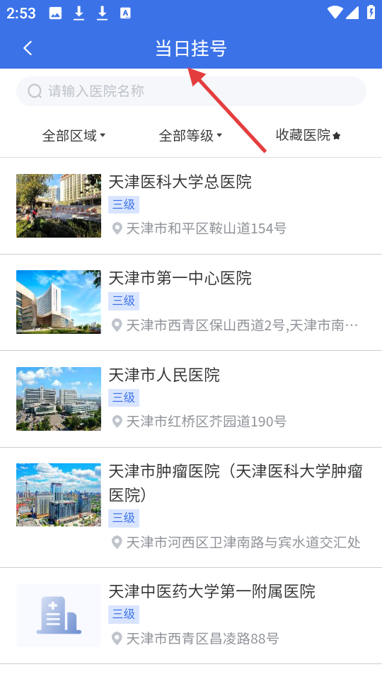 2、當(dāng)日掛號(hào)界面能搜索醫(yī)院,列出天津醫(yī)科大學(xué)總醫(yī)院等,含等級(jí)和地址信息,還可按區(qū)域、等級(jí)篩選及收藏醫(yī)院。