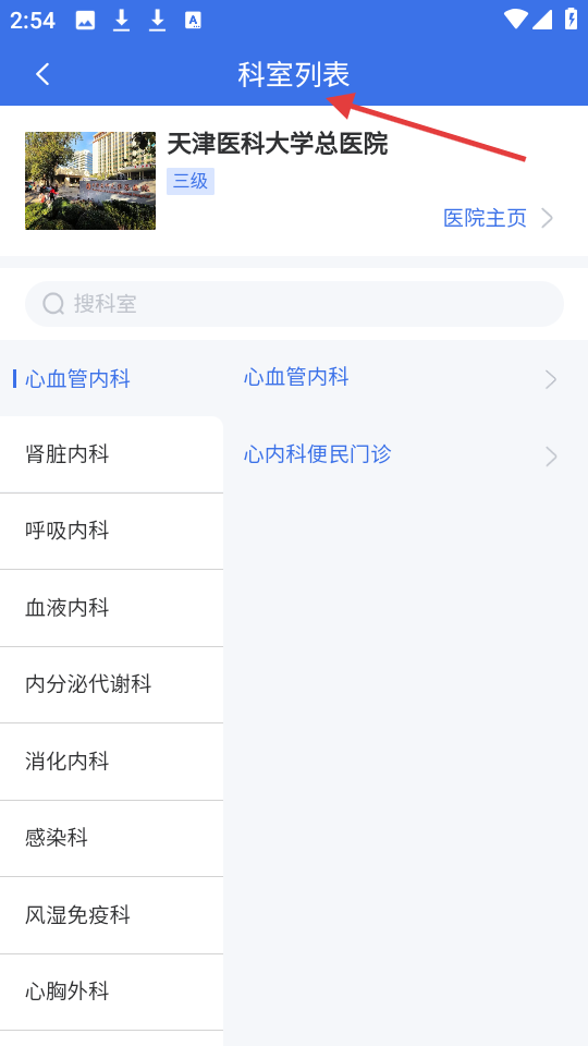 3、天津醫(yī)科大學(xué)總醫(yī)院的科室列表頁(yè)可搜科室,呈現(xiàn)心血管內(nèi)科等,點(diǎn)擊科室能進(jìn)一步操作,還有醫(yī)院主頁(yè)入口。