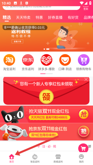 1、首頁分類欄精選、天天特賣等清晰,淘寶返利,等平臺入口醒目,新人紅包彈窗吸睛,底部首頁按鈕錨定主陣地。