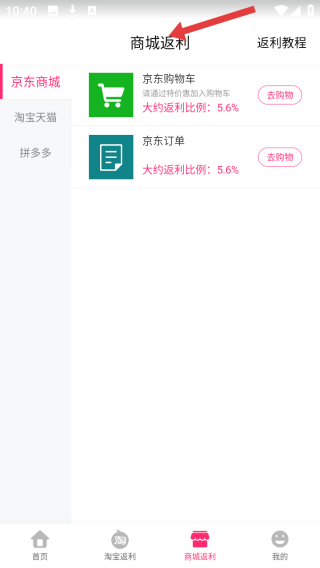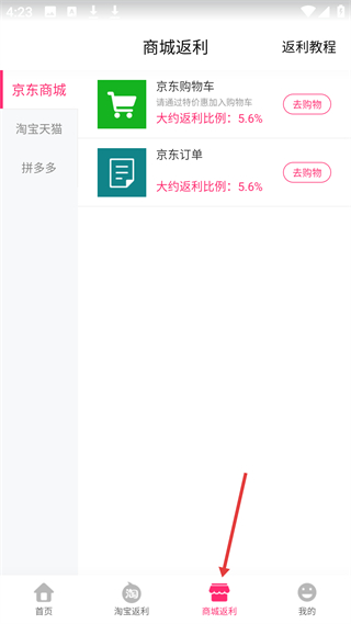 4、商城返利板塊有京東購物車、訂單入口,返利比例約5.6,還可切換淘寶天貓、拼多多板塊,多平臺購物享返利。